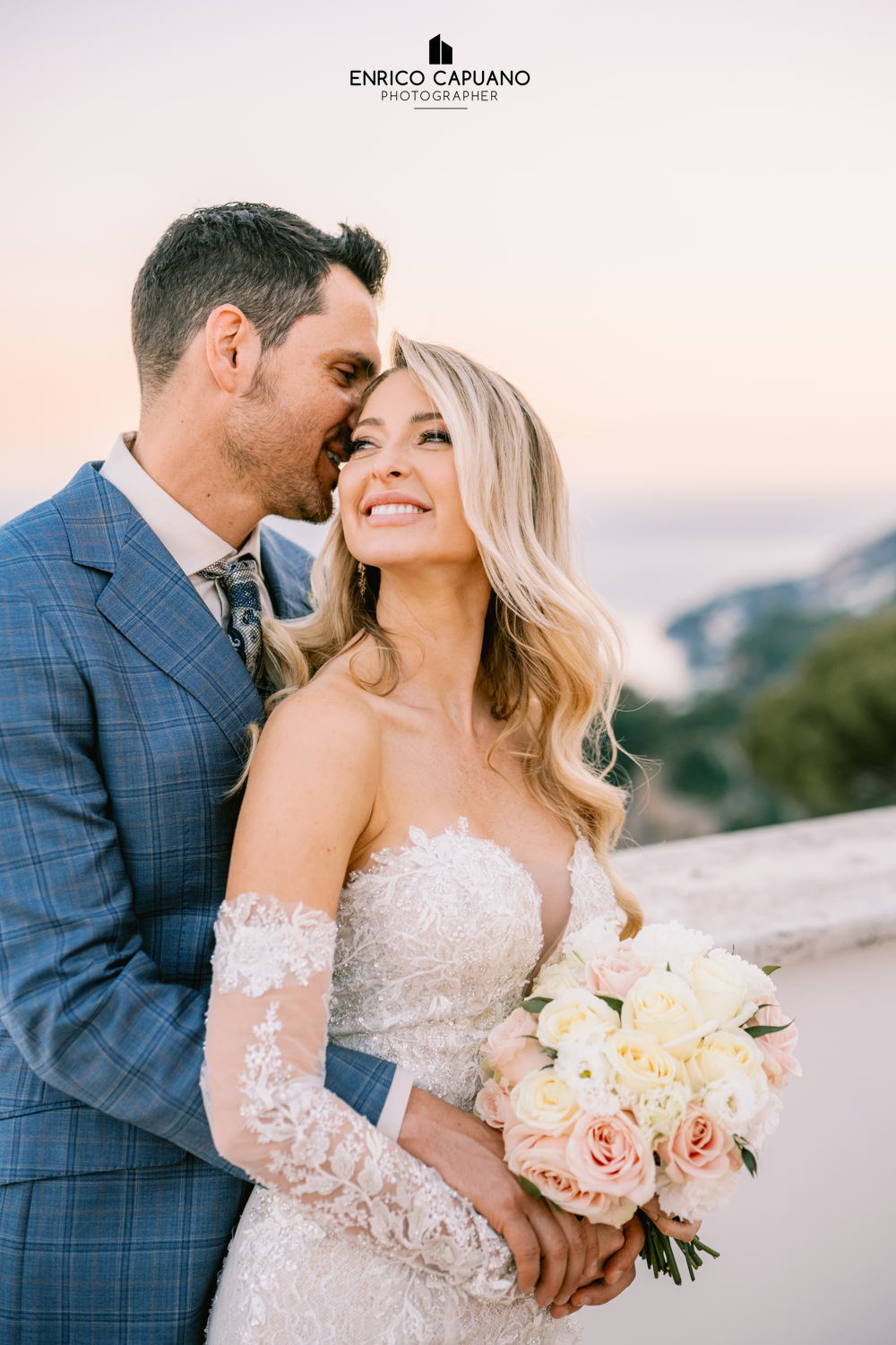 A romantic moment shared by Alicia and Aron on the terrace of Villa Eva, surrounded by the endless panorama of the Amalfi Coast, where love and beauty blend into a timeless scene