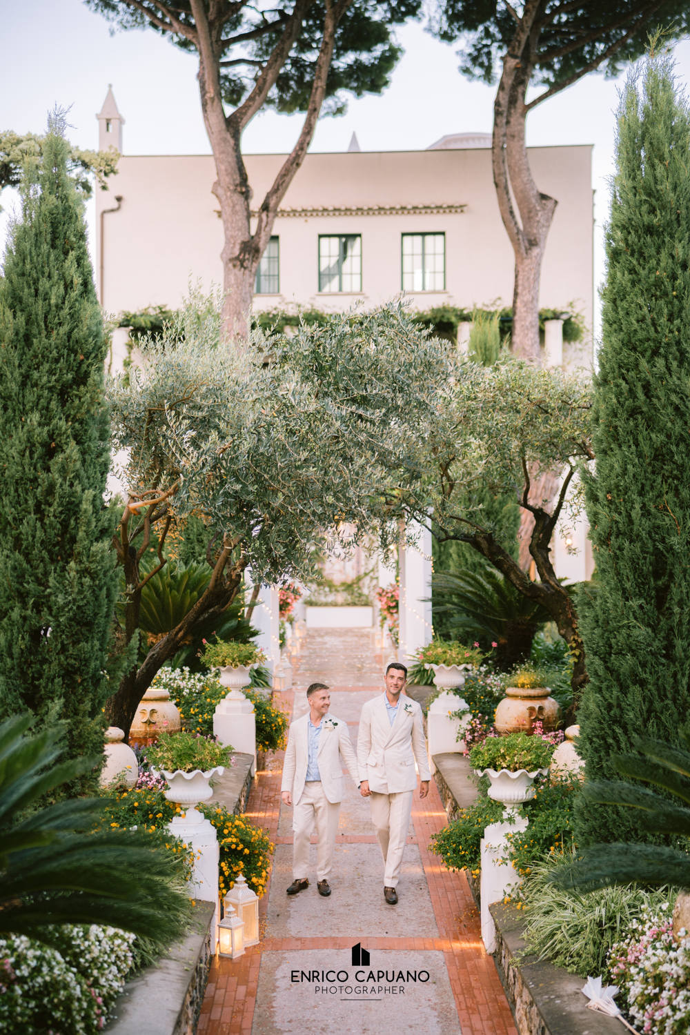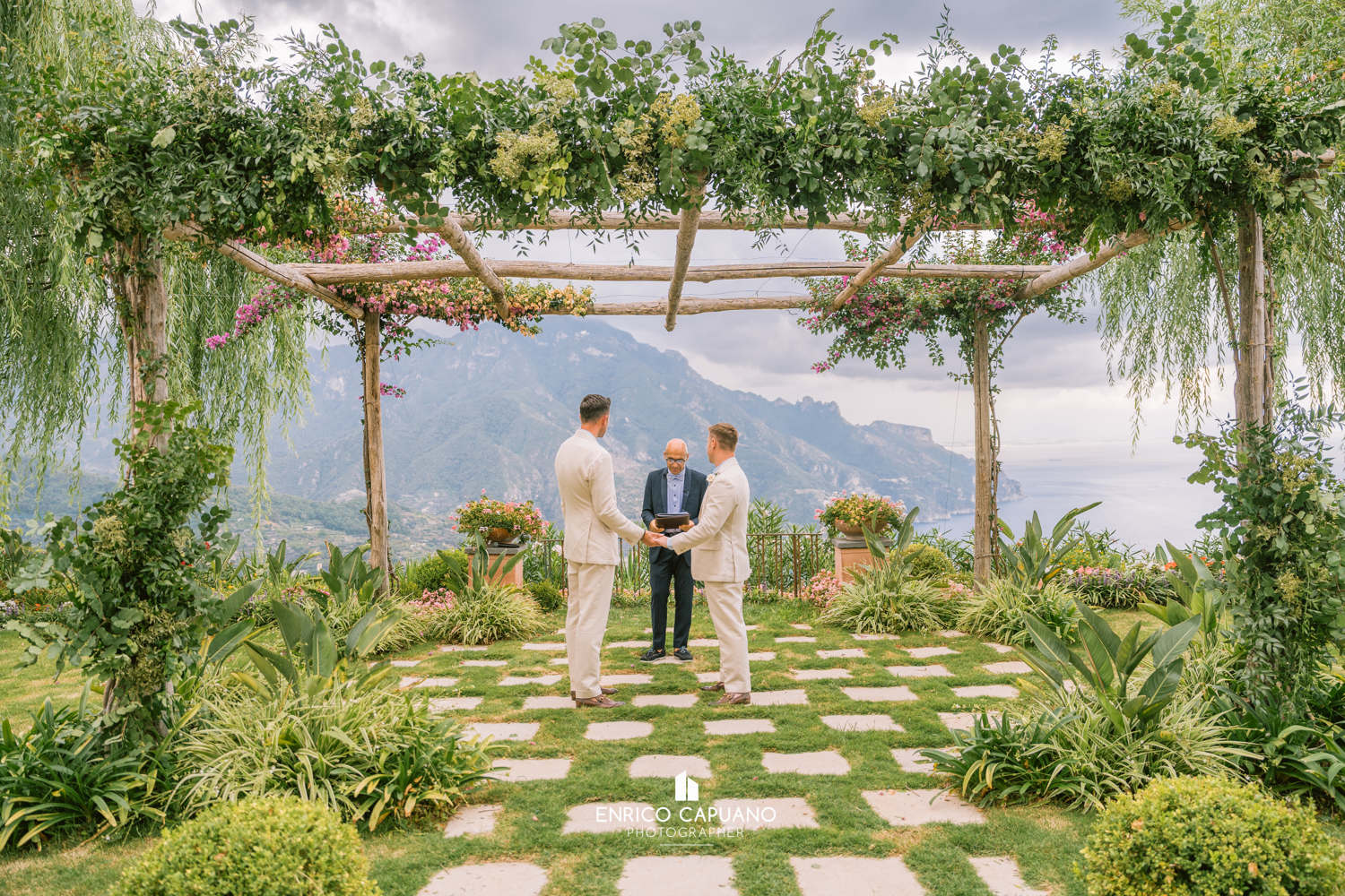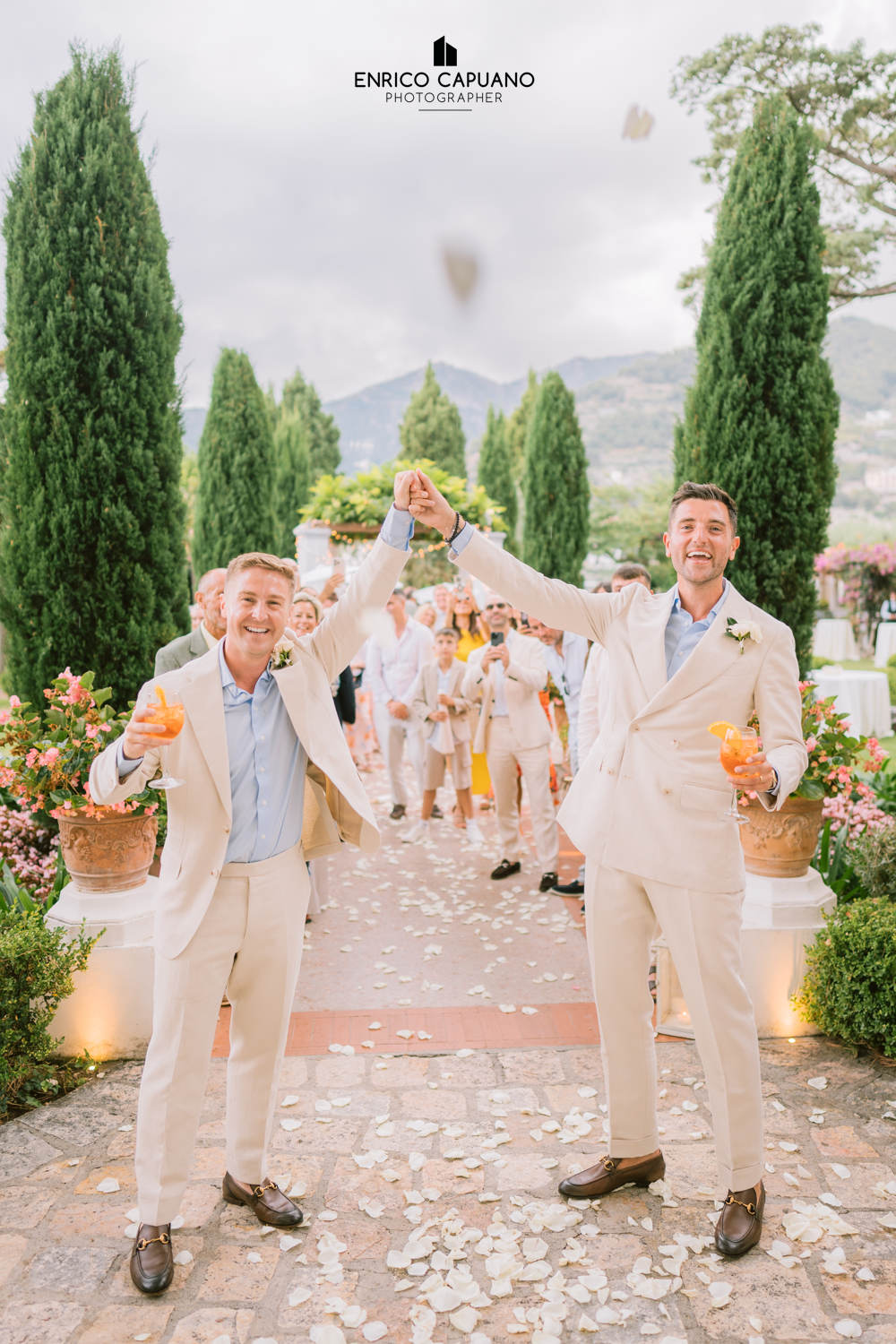 This is a photographic story by Enrico Capuano, who captured the beauty and emotion of Stuart and Tom’s same-sex wedding. A wonderful couple, Stuart and Tom chose the stunning Villa Eva in Ravello to celebrate their love, surrounded by the timeless charm and breathtaking atmosphere of this enchanting destination. Through Enrico Capuano’s lens, their wedding day unfolds as a visual narrative filled with authenticity, joy, and the magic of Ravello