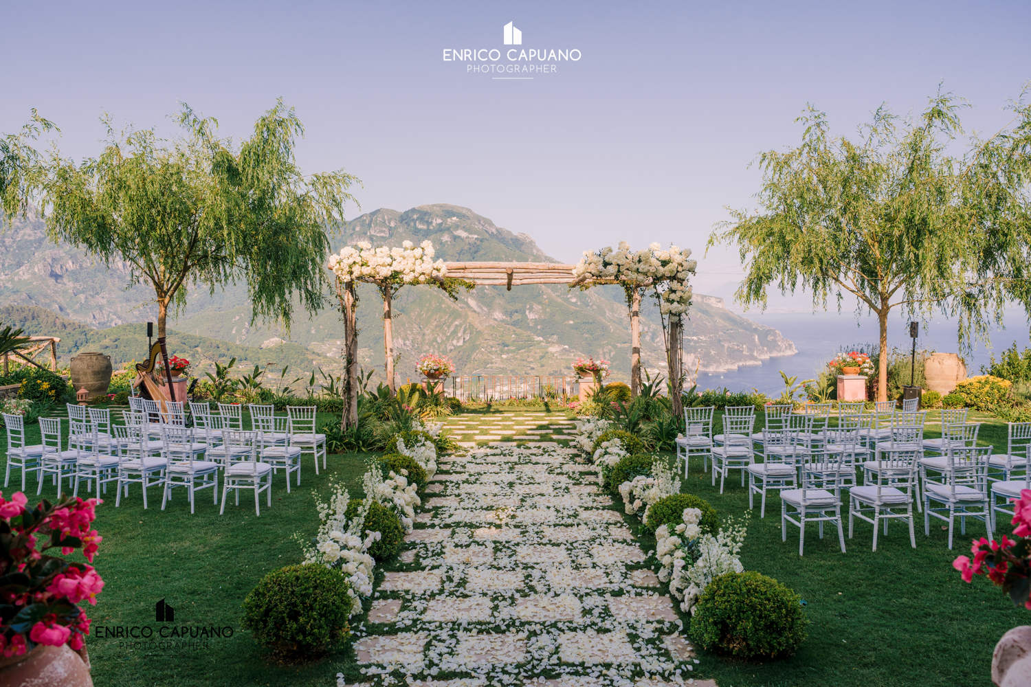 Ceremony area at Villa Eva in Ravello, designed by wedding planners Mario Capuano and Annamaria Staiano, featuring a luxurious setup with elegant white flowers. Perfect for a sophisticated Amalfi Coast wedding.